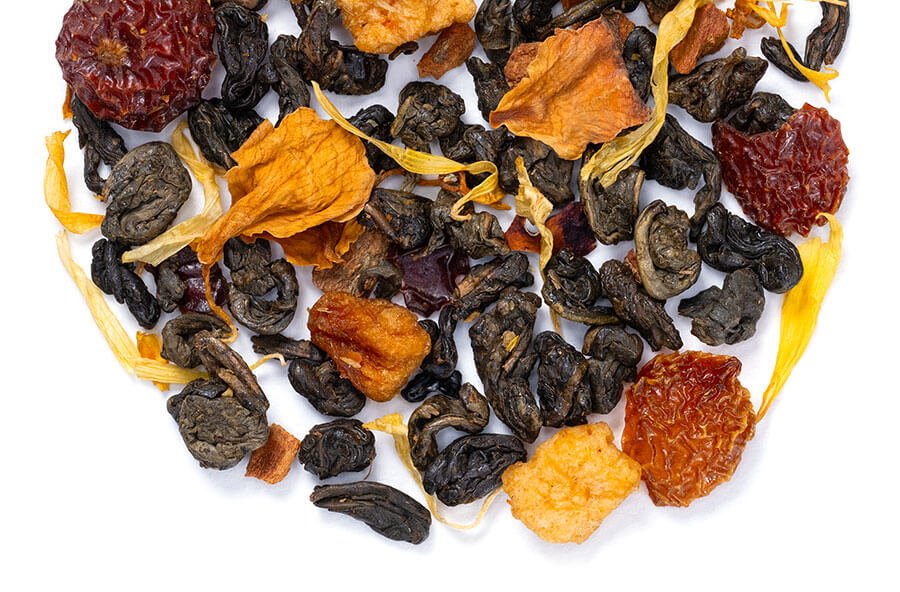 Gently smoky gunpowder combined with bright tangy apples and rose hips, bring to mind a misty morning stroll. Hints of cinnamon and creme brulee flavor warm and comfort you like a favorite sweater.