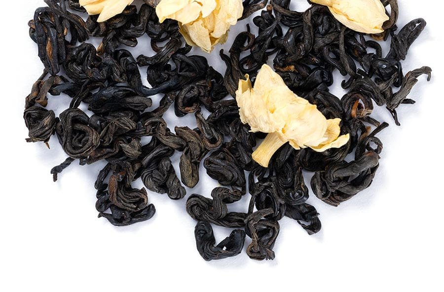 This beautiful jasmine black tea is an exquisite selection for black tea and jasmine lovers alike. High grown on Song Luo Mountain in the tea-famous Anhui province, the beautiful dark leaves of Black Jasmine Song are hand rolled and oxidized to perfection, then scented with night-blooming jasmine flowers. The mahogany hued cup is medium-bodied offering layered notes of red fruits and hints of spice that are gently complemented by soft, subtle jasmine and a smooth finish. We could not pass it up!