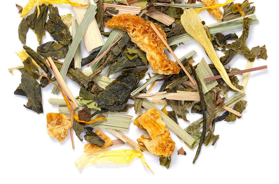 Ingredients: green tea, lemon grass, spearmint leaves, lemon verbena, orange, marigold flowers, natural lemon flavor & natural orange flavor