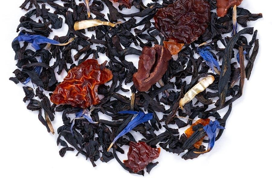 Ingredients: black tea, keemun concerto tea, rose hips, cocoa nibs, lapsang souchong tea, whiskey flavor, blue cornflowers, natural vanilla flavor & natural candy apple flavor