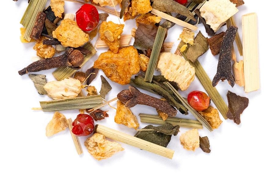 Ingredients: lemon grass, cinnamon, ginger, white tea, pineapple pieces, cloves, coconut, cardamom, apple pieces, red peppercorn, natural spice flavor & natural cinnamon flavor